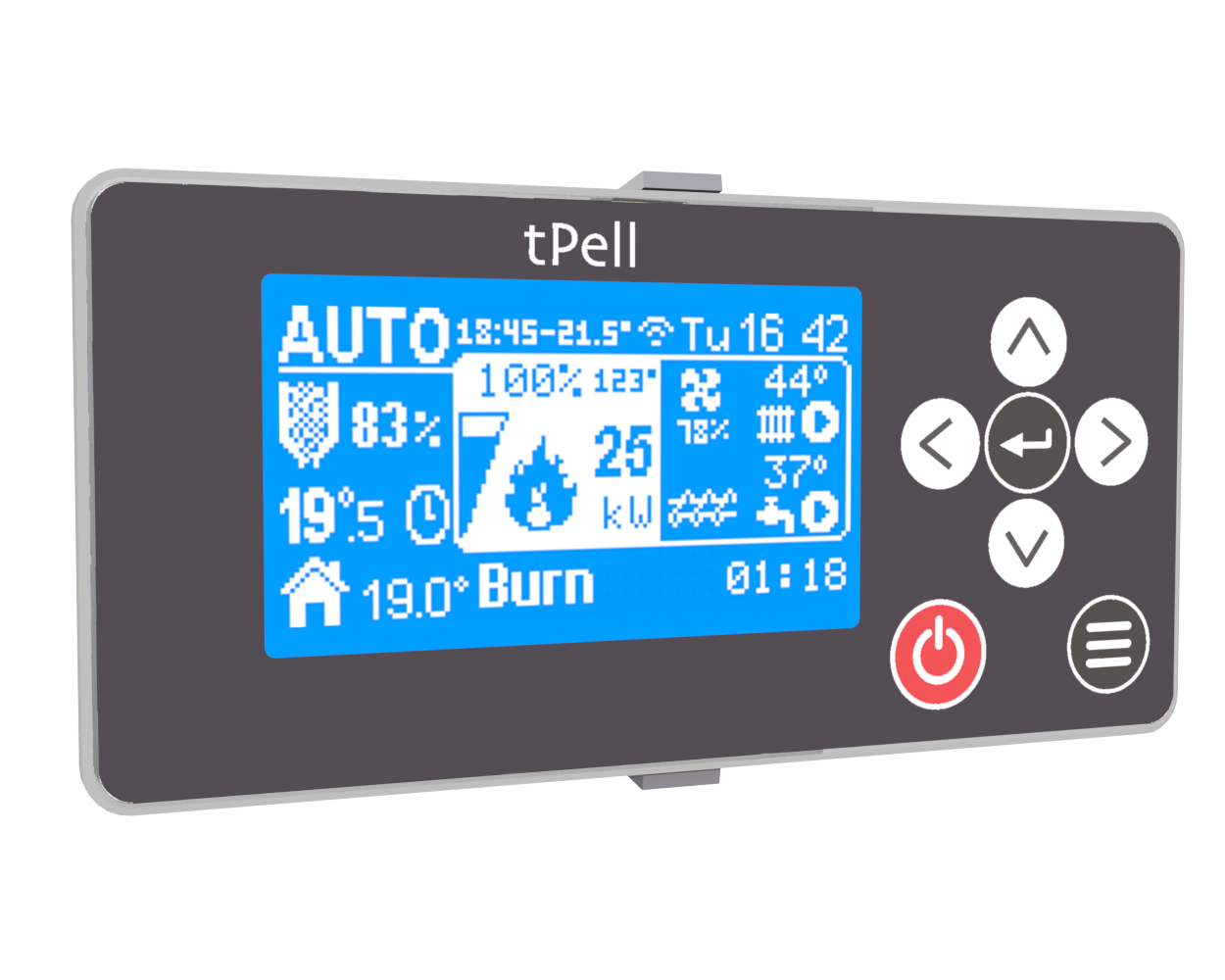 Stylish contemporary user interface pellet controller with color 4.3" IPS touch display for pellet stoves.